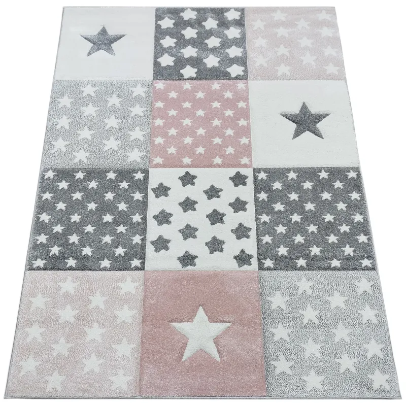 Dywan dziecięcy wykonany z wysokiej jakości polipropylenu, charakteryzujący się dużą miękkością i trwałością. Jest gruby i przyjemny w dotyku, dzięki czemu zapewnia komfort podczas zabawy na podłodze. Wzór z uroczymi gwiazdkami został starannie wycinany, co nadaje całości efektu trójwymiarowości i sprawia, że dywan prezentuje się wyjątkowo elegancko. Utrzymany w delikatnej kolorystyce szarości, kremu i pastelowego różu, świetnie komponuje się z aranżacją dziecięcych pokoi, wprowadzając atmosferę ciepła i przytulności. To praktyczne i dekoracyjne rozwiązanie, które łączy w sobie estetykę oraz funkcjonalność.